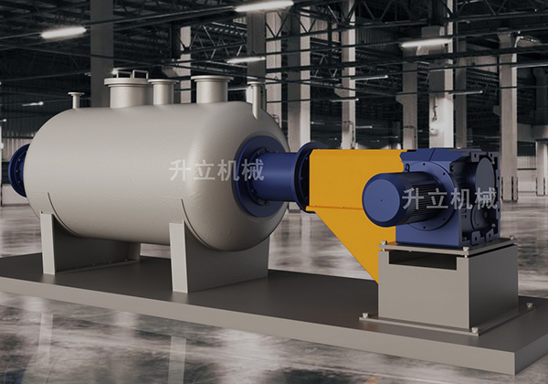 具有臥式筒體,內(nèi)裝螺帶旋轉(zhuǎn)軸,軸上內(nèi)、外螺帶相互推送物料,攪刀快速翻轉(zhuǎn)物料,在高溫狀態(tài)下使物料不停運動實現(xiàn)動態(tài)均勻受熱。
